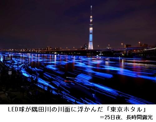 ホタルが染める隅田川 スカイツリーと競演 東京 ―― 隅田川に25日よる、青い光を放つ「ホタル」が出現した。/光の正体は、「いのり星」と名付けられた直径約10センチのプラスチック製のLED「発光ダイオード」球。(東京を世界に誇れる美しい都市へ」との願いを込め、墨田、台東両区などでつくる実行委員会が主催した。/午後7時過ぎ、約10万この光の玉が流されると、川面に揺られながら帯状に広がった。訪れた人は、ライトアップされた東京スカイツリーとの競演を楽しんだ。〔朝日新聞 2013年5月26日〕