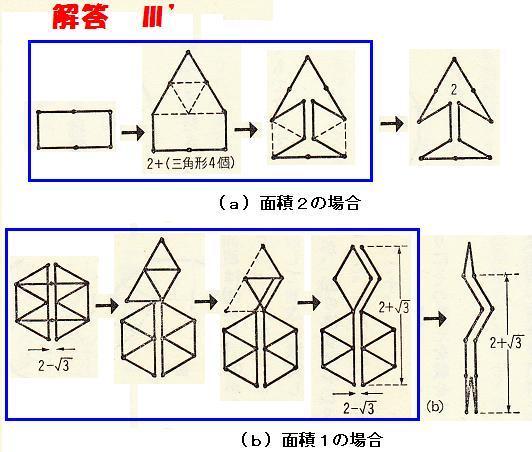 12本のマッチ棒で囲まれた面積2、1の図形は左図の解答Ⅲ’のようにしても作ることができる。