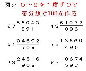 もう一つの問題は、左の図1のように、1~9の数を1つずつ使用し、帯分数の形で100を表すもので、イギリスのHenry Ernest Dudeney(ヘンリー・アーネスト・デュードニー)によって、11の解が発表されている。