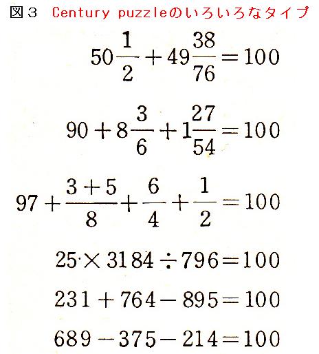 現在の小町算の中で、100作り(Century Puzzle)と仮分数の問題であろう。