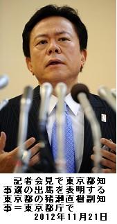 「継承」「刷新」構図固まる 猪瀬氏「石原さんとのコンビ続く」―― 東京都の石原慎太郎前知事の辞職に伴う知事選で、都副知事で作家の猪瀬直樹氏(66)が二十一日、都庁で記者会見し、無所属で立候補することを正式に表明した。石原氏から後継指名を受け、都政を「継承」する猪瀬氏に対し、ほかの立候補予定者たちが「刷新」を訴えるという選挙の構図が固まった。/猪瀬氏は「都民の安全と安心を守るため、日本の国を東京から支えるために、重責を担う決心をした」と説明。石原氏との関係について「石原さんと僕のコンビは続いていく。国政で彼がやり、都政で僕がやる。話がつきやすい」と蜜月ぶりをアピールした。/公約として、老朽化した火力発電所を最新鋭の天然ガス火力に置き換える電力エネルギー改革のほか、東京メトロと都営地下鉄の経営一元化、二〇二〇年夏季五輪の東京招致推進など、石原都政の主な政策を掲げた。/経営再建中の新銀行東京の存廃については「重要な争点ではないと思う」とし、「現状を改善することに尽きる」と述べた。/猪瀬氏は石原氏に請われて〇七年六月に都副知事に就任。石原氏の辞職後は、知事の職務代理者を務めている。今月二十九日の告示まで副知事にとどまる見通し。/猪瀬氏をめぐっては自民、公明が支持を決め、日本維新の会とみんなの党も支援の方針を明らかにしている。/都知事選では、前神奈川県知事の松沢成文氏(54)、前日本弁護士連合会会長の宇都宮健児氏(65)、元自民党総務会長の笹川尭(たかし)氏(77)らが出馬を表明している。 〔東京新聞 2012年11月22日 朝刊〕