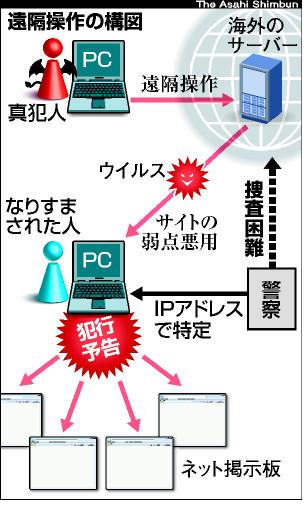 ◇捜査員に負担増: 「パソコンをウイルス感染させて遠隔操作するのは、サイバー攻撃でも使用されており、技術的に目新しくはない。だが、乗っ取ったパソコンで所有者に成り済ます手口は異例だ」。警察庁幹部は危機感を募らせた。/書き込みをしたPCの所有者から「容疑者」を割り出したはずだった。しかし、大阪府と三重県の2人の男性のPCがウイルスに感染していたことが9月19日に判明。PCの所有者2人が釈放される事態となった。/さらに、大阪のケースでは、何者かが▽海外のサーバーを経由してPCを遠隔操作した▽犯罪予告の書き込み後、遠隔操作でウイルスファイルやアクセス履歴をPCから消去した−−など手の込んだ工作で犯行の痕跡を消していたことも分かった。/一連の事件を受けて警察庁は、刑事、生活安全、情報技術の各部門などを中心に対策の検討を始めた。特効薬はなく、対策としては、まず、IPアドレスなどで特定した関係者にウイルス感染の可能性を聴くことや、押収したPCを綿密に解析するなどの従来の裏付け捜査の徹底を求める。だが、今回使用されたウイルスは新種とみられており、従来の対策ソフトで検知できなかった。膨大なプログラムの中から不審点を見つけるのは不可能ではないが、「砂浜で指輪を捜すようなもの」(警察庁幹部)との声も聞こえてくる。/このため警察内部では、今後の捜査で現場の負担増は避けられず、現在の体制のままでは不十分との指摘も出ている。警察庁をはじめ、全国の管区や都道府県警には、総勢数百人の技術職員がおり、PCや携帯電話など、電磁的記録の解析作業を行っているが、さらに増える押収品すべてを解析するのは難しい。/警察庁は来年度の概算要求に、「サイバー空間の脅威への対処」費用として、約24億円を盛り込み、サイバー犯罪の取り締まりや、サイバー攻撃捜査に携わる専従警察官を全国で約270人増員することを計画している。/捜査幹部は「捜査の充実を図るのは当然としても、新種のウイルスについて民間のウイルス対策会社と連携を図ったり、一般に警報を流して注意を促すなどの対策が必要だ」と話す。