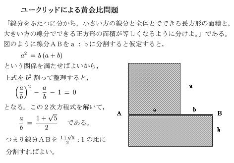 ユークリッドの原論では、「線分を2つの部分に分けて、小さいほうの線分と全体の線分とで出来る長方形の面積と、大きいほうの線分で出来る正方形の面積を等しくせよ」という形で提起されている。