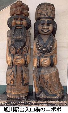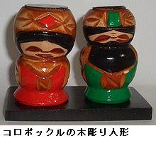 13 nipopo〔ニポポ、ni(木)+popo(赤ん坊) 木の人形〕:郷土玩具。「ニポポ」にはアイヌ語で「小さな木の子供」「人形」という意味がある。縦長の木に丸い顔が彫られたもので、胴は八角形のこけしのような形状をしている。一つの台座に男女一対の人形を並べたものが多い。/狩猟の際、ニポポに祈念すると必ず狩猟が成就するという信仰があり、狩猟で捕らえた動物を料理する際は、まずニポポの口に供えるという風習があった。また、ニポポに願い事をして、それが成就された時は、ニポポの首に装身具を飾る。