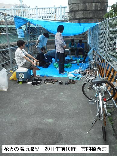 言問橋西詰の遊歩道の行き止まりの所〔スカイネットの直ぐ傍〕で青いシートをかぶせその下で宴会を開いている若者の一団が居たので、何をしているのかと、訊ねたところ、今度の日曜日に開催される隅田川花火大会の場所取りだという。どうやら、どこかの大学の部活のグループらしい。勿論、交代ではあろうが、1週間ここに釘付けになるのらしい。