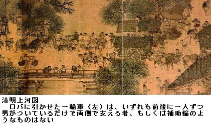 東京の荷車は、大きいものを「太平」といった。車台の上に板塀がついているが無蓋である。板塀は手摺上をした平板なもので、その前方に長さ二、三尺あまりの二本の腕木が突き出している。馭者はその間に身を置き、鞭と取り綱を左右の手に持って車をあやつる。前にはラバあるいはロバ二十余頭をずらりと二列につなぐか、または牛が五頭から七頭ぐらいで引く。車の両輪は板塀と高さが等しい。車台の後ろには二本の斜めに延びた木の足があり、その中間に鉄の鈴がつるしてあって、動くと鳴り、遠くから通行人にも車を避けるよう注意させた。なお、車の後ろにもロバかラバを二頭つなぎ、急な道や橋を下る場合、鞭をふるっておどし、車を後ろから引かせて制動をかけ、ゆっくりと進ませた。この車は数十石〔数トン〕もの荷を積載することができた。官庁の車も、ただロバを用いる点が違うだけで、これとほとんど同じであった。その次に平頭車というのがあった。これは太平車に似てより小さく、両輪の前方に長い木を突き出して轅木(ながき)とし、その端に横木を渡し、1頭の牛をその轅木の中に入れて、横木を牛のうなじに乗せた。人はその横に立ち、手で牛の鼻綱をとって引いて行くのだ。正酒店(おやみせ)は多くこの車に酒の梢桶(たる)をのせた。梢桶は、長い水桶状で、表面に靨口(えくぼぐち)がついている。毎梢(ひとたる)に三斗ばかりはいり、値段は一貫五百文であった。