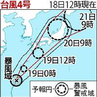 台風4号 19日夕方~夜、最接近 ―― 岡山地方気象台は18日、強い台風4号について、19日夕方から夜にかけて県内に最接近すると発表した。強い風や高潮、土砂災害などに注意を呼びかけている。/18日午後5時現在の発表によると、台風4号が予想進路を進んだ場合、19日昼前から局地的に雷を伴った激しい雨になるおそれがある。同日午後6時までの24時間降水量は、県内平均で40ミリ、多いところでは80ミリで、その後も降り続く見通し。また、ここ数日の雨で地盤が緩んでいる場所では、土砂災害への警戒も必要という。/風は19日昼前から強くなり、最大風速は南部の陸上で13メートル(最大瞬間風速25メートル)、海上で18メートル(同30メートル)、北部の陸上で12メートル(同25メートル)と予想。普段より干満の差が激しい大潮の時期と重なるため、満潮時刻(宇野港では19日午後11時49分)前後には高潮にも注意が必要という。/同気象台は「台風4号は移動速度が速く、予想より早く接近する可能性がある。早めの対応を」としている。