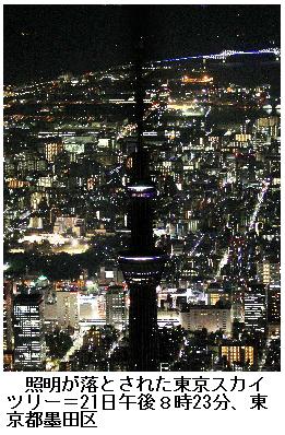 夏至の夜、節電に思いを スカイツリーも消灯 ―― 夏至の21日夜、全国各地の盛り場や観光地などで照明が一斉に落とされた。先月開業した東京スカイツリーでも通常のライトアップが消灯され、地球温暖化防止のPRに一役買った。/イベントは、環境省が2003年から取り組んでおり、不要な明かりを消すことで、照明に慣れた日常を見直そう、という狙いがある。午後8時から2時間の消灯の呼びかけに、全国の1万6千を超える施設や企業が賛同した。