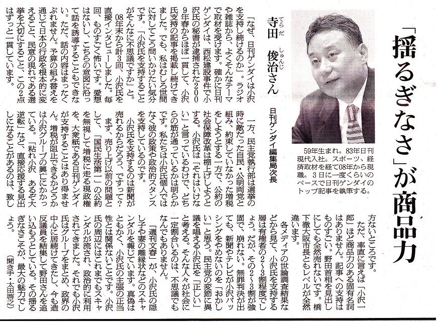 しばらくして、携帯にメールが届いた。曰く、「今朝はご連絡有難う御座いました。/朝日新聞が小沢一郎擁護に近いこの様な「小沢一郎感」を掲載することと、消費税衆議院通過の翌日であったことも意味あることだと考えられます。昨日の衆議院での可決のさまを見る時、歴史の輪に繋がる「大政翼賛会」の雰囲気を肌で感じ、寒気を覚えたのかもしれませんね。どちらにせよモンロー主義の悪弊と我身の瞬時の欲望にのみ流される政治家は見るに耐えません。理念と希望と言えば美しく聞こえますが、政治家たるもの少しは筋の通る理念を見せて欲しいものです。何かしらこのまま死にたくはない気がします。まだまだ精神的には政治に対する青春期を脱していないのかもしれません。」