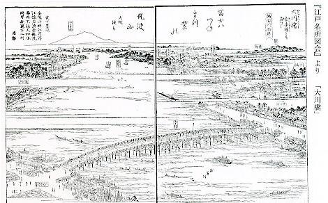 下の絵は、「隅田川」という酒をつくる水を汲み上げたであろうと思われる辺りの隅田川の絵で、「隅田川」を造った酒屋さんがあった並木町は、この絵の左下延長線上に当たりる。描かれている橋は「吾妻橋」。今は橋の袂が水上バスの発着所になっている。