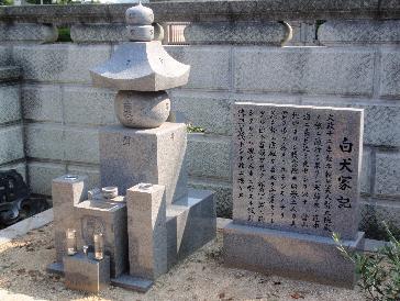 白犬墓の話:「昔、文政12年(1829)頃、今の東京、その頃の江戸に松平賴恕(よりひろ)といわれる讃岐〔9代目〕のお殿様がいらっしゃった。その奥方〔倫姫〕は大変な慈悲深い方であった。それは動物にいたるまで憐れみを持っておられた。/ある日のこと、どこからとなく迷い込んで来た一匹の白犬をお屋敷の門番が見つけた。「やい、ここはお殿様のお屋敷だ。野良犬(のらいぬ)の入るべき所ではない。出ろ、出ろ!!」お屋敷の門番は荒々しくも六尺棒(ろくしゃくぼう)を振り上げたが、白犬は「門番さま、どうぞひとめ奥方様にあわせて下さいまし。」というように尻尾(しっぽ)を振り振り頼んだが聞いてくれなかった。「何んだッて出なければこうしてやるッ!」と、無惨(むざん)にも六尺棒は白犬の頭上めがけて振り下された。「キャン!」バッタリと一撃の下に倒された白犬。このことを聞いた奥方の倫姫は不憫(ふびん)に思い、白犬を浅草清光寺に葬られた。/その後、奥方様(倫姫)は亡くなられた。今日は、その貴い柩(ひつぎ)が多数の家臣に護られて讃岐の菩提寺(ぼだいじ)仏生山へと送られて行く日である。その時、長い東海道を何時までも、お棺について離れない小さい白犬があった。その間、人々が食物を与えても、決して生臭いものは食べなかったという。/華やかな葬いが済んで七日目、瀬戸内海を通る一艘(いっそう)の船の中に、件(くだん)の白犬の姿が見あたった。心ある藩士のはからいで、江戸に上る人に頼んで白犬を送り届ける途中であったが、白犬は常に哀しそうにクインクインと泣いていたが、突然隙(すき)を見て海中に飛込んでしまった。今、高松市五番丁浄願寺境内にある白犬墓はその犬を葬った墓である。」