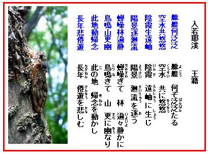 王籍(おうせき、生卒年不詳)は南北朝時代・梁の詩人。五言詩「入若耶溪」中の「蝉噪林逾静 鳥鳴山更幽」対句はあまりに有名で、「閑さや岩にしみ入る 蝉の声」と詠んだ芭蕉は多分この詩を知っていたのだろう。 若耶溪(じゃくやけい)は紹興の近くにある名勝で、西施がこの畔で生まれたと云われている。古来、多くの文人墨客が訪れたところだという。
