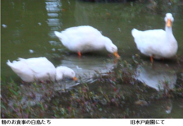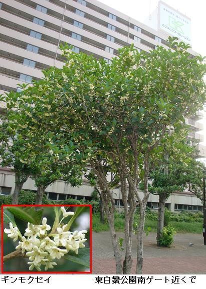 水神大橋を渡り、東白鬚公園に入る。南進して、南ゲート付近になると、今までは未だ夜が空け切らぬうちにこの場所を通ったのでか気付かなかったが、金木犀と銀木犀の並木が併行して植えてある。白い花を咲かせる銀木犀は、金木犀に比べて花が少なく、香りも弱くて地味なので、あまり人気が無いが、本来は銀木犀のほうが原種であるという。