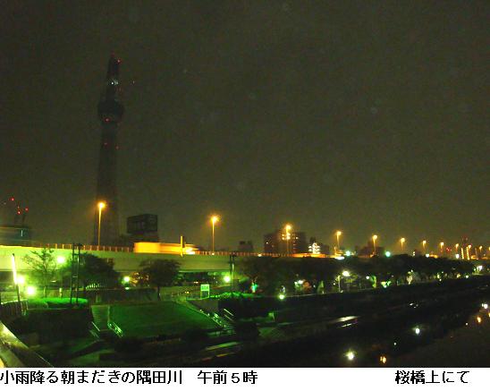 午前5時30分、夜中に降っていた雨も止んだようなので家を出掛けて、僅かに白み始めた隅田公園を南下、吾妻橋辺りまで来るとどうやらまた降り出してきたらしい。昨日のようにずぶ濡れになるのは厭なので、今来た道を引き返す。遊歩道は土のみちでぬかるみが多いので、土手のコンクリートの道を急いだ。小雨の中、言問橋と対岸に見えるスカイツリーをカメラに収めた。スカイツリーは完成の暁には634m、現在周辺の人人はその威容に驚き、やれ観光だ、グルメだと騒いでいるが、それも完成後2・3年のことだろう。いやはや、世界ではもはやスカイツリーなんて目じゃありませんたい。そんなことを考えながら、帰宅した。
