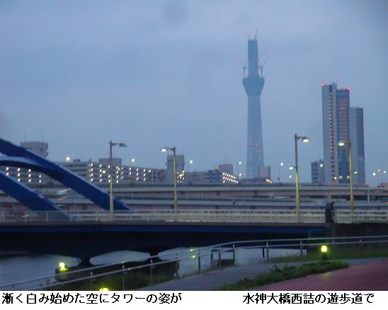 桜橋~水神大橋間をひと回り。行きは殆んどが夜道。東白鬚公園内の梅若橋を越え、東京都リハビリテーション病院のまえをとおって、水神大橋を渡る頃辺りが漸く白み始める。全天雲に覆われ、所々に青空が見える。今日はスカイツリーに雨雲がかかっていないので、この後晴れるだろう。