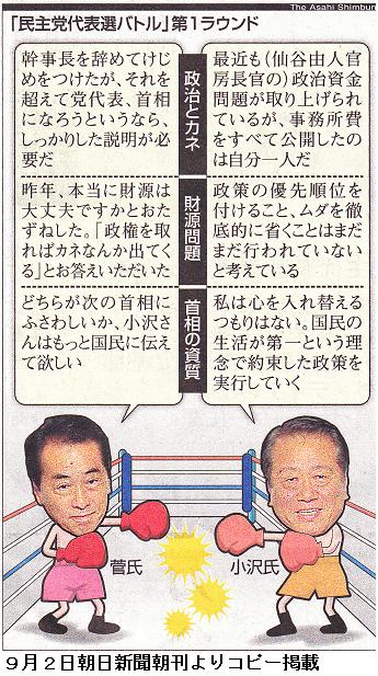 新聞も、テレビも小沢氏出馬で持ちきり。まあ、たっぷりと政策論争をやって欲しい。清廉潔白もよいが、これだけでは政治は進歩しない。菅首相と小沢氏の言い分では最早勝負がついているようにも思える。今朝のウェブニュースから。