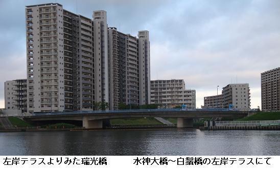 午前5時。桜橋の上で前方のビルの上にご来光。墨堤通りを北上、何時ものように水神大橋を渡って川沿いの遊歩道を南下。本日は風もなく朝日を浴びての徘徊となる。瑞光橋から見るリバーサイド隅田のビルと東京スカイツリーが競うようにその姿を川面に写している。