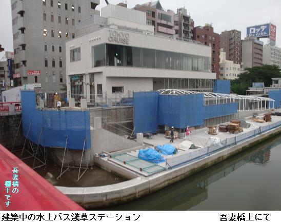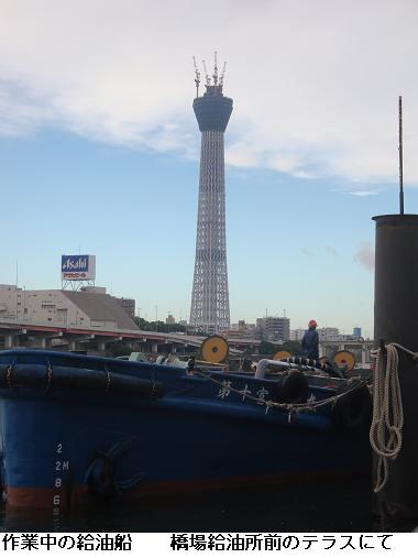雨雲が垂れ込めて今でも降りそうな様子なのにスカイツリーは影がアサヒビールのジョッキビルにくっきりと映し出されている。水上バスの淺草ステーションの建設工事は朝早くから進められている。左岸の墨田区役所裏手の広場では勝安房先生が立っていらっしゃる。東京スカイツリーと一緒にカメラに収めさせてもらった。