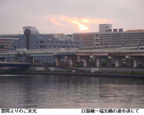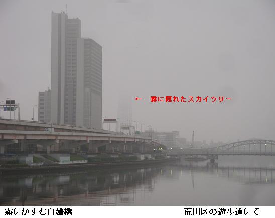 霧の立ちこめる隅田川の桜橋~水神大橋間をひと回り。霧のためスカイツリーは雲隠れ。大変蒸し暑く、汗が滲んでくるが、川面はいたって静か。昨夜北区や板橋区で土砂降りの被害が出たなどとはとても想像つかない。9222歩、5.99kmの徘徊であった。
