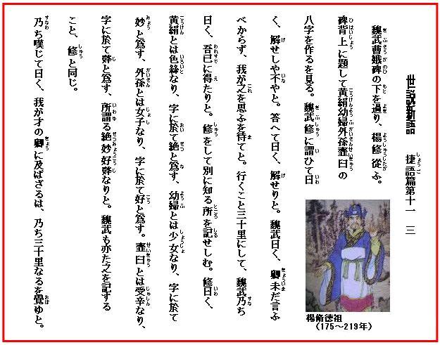 魏の武帝(155~220年、曹操)があるとき曹娥(そうが)の碑の下を通り過ぎたことがあるが、楊修(? - 219年、曹操に仕えた武将、字は徳祖)もお供をしていた。碑の裏に「黄絹幼婦外孫韲臼」の八字が書かれているのを見て、魏の武帝は楊修にいった。「わかるか、どうかね」