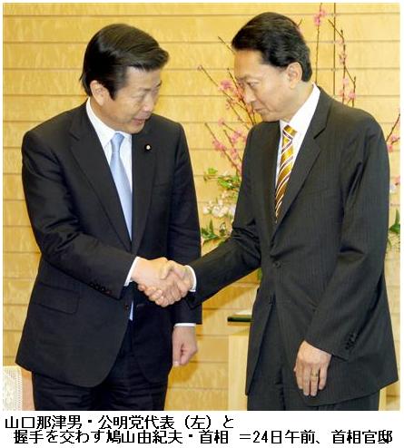 公明党が鳩山政権ににじり寄り 首相も秋波 露骨な自民離れ ―― 公明党の山口那津男代表は24日、鳩山由紀夫首相と首相官邸で会談し、介護施設待機者解消や、低年金・低所得者の利用者負担の見直しなど12項目の政策提言「新・介護公明ビジョン」を提出した。公明党は“野党暮らし”に焦りを募らせているようで、自民党をジワジワと遠ざけ、政府・与党ににじり寄る姿勢が鮮明になってきた。/「われわれが調査結果をもとに政策提言にまとめました。お渡しします」/山口氏がやや緊張気味に提言を差し出すと、首相は「大いに参考にしたい。具体的な内容を早速検討するよう厚生労働省に促したい」とにこやかに応じ、速やかに長妻昭厚生労働相を呼んで検討を指示した。/山口氏の政治資金規正法改正に向けた与野党協議機関設置の求めにも、首相は「民主党として早急に立ち上げたい」と応じた。/首相の思わせぶりな態度に山口氏は大喜び。その後の記者会見では、他の政策課題についても「政府から呼びかけがあれば、積極的に対応したい」と述べ、鳩山政権への協力姿勢をアピールした。/「福祉の党」を掲げる公明党は、社会保障政策で「大きな政府」志向が強く、自民党より民主党に近いといわれてきた。党内人事では民主党の小沢一郎幹事長に近いとされる市川雄一元書記長を常任顧問に起用するなど「民主党シフト」を取りつつあり、今回のトップ会談もその一環との見方は強い。/今回の政策提言でも、自公政権で平成24年3月の廃止方針を決めていた介護療養型医療施設を「倍増」と明記するなど自民党離れは露骨になっている。山口氏は、自民党の審議拒否戦術を「審議に応じないのは国民の期待に反するのではないか」と批判してみせた。/公明党は18日には、みんなの党と公務員制度改革や地域主権型道州制の導入で政策協議を行うことで一致した。みんなの党と足並みをそろえ、「改革の党」をアピールし、第3勢力としての存在を高めたいとの思惑も透けてみえる。 (産経ニュース、2010.2.24 21:53)