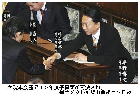 「まだその質問は気が早いんじゃないでしょうか。まだようやく衆議院を通過したということでありまして、これから参議院があります。まだ半分が過ぎたということでありましてね、年度内を目指してこれからは努力をするということではありますが、そんな簡単な話ではないと、そのように思っております。ですから、まずは予算を参議院でもしっかりと議論して上げるというのが今、私の頭のすべてです」「そうは言いながら、もし、その質問に答えるとすれば、これからさらに関連法案もありますしね、上げなければならない法案が衆議院にもまだたくさんあります。そういったものをしっかりと議論して上げていくということが大事じゃないでしょうか。さらには(米軍)普天間(飛行場移設問題)をはじめとする議論も、あと5月末までですと、3カ月ですから。しっかりと進めていかなきゃならんとは思います」
