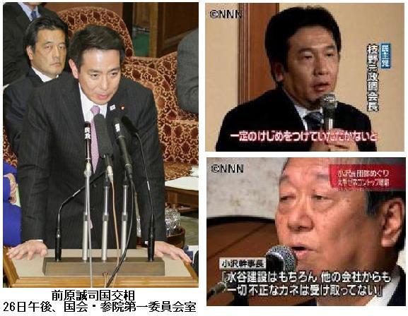 小沢氏の責任問題、民主内で発言相次ぐ 「けじめ」「自浄能力を」 ―― 民主党の小沢一郎幹事長の資金管理団体の土地購入を巡る政治資金規正法違反事件で31日、政府・民主党内から小沢氏の責任問題に関する発言が相次いだ。小沢氏の元秘書で逮捕された石川知裕衆院議員の拘置が2月4日で期限切れとなり、捜査が大きな節目を迎えるのをにらんだ動きで、党内も慌ただしさを増しそうだ。/ 枝野幸男元政調会長はさいたま市内での講演で、小沢氏について「(自らの)説明に一定の国民の理解と納得が得られなければ、けじめをつけていただかないといけない」と表明した。/前原誠司国土交通相も京都市内の会合で「新たな局面が生まれたときには、我々は厳しく自浄能力を発揮しなくてはいけない」と指摘した。事件の展開次第では、党として幹事長辞任を要求すべきだとの立場を示したものだ。(NIKKI NET 、31日 21:31)