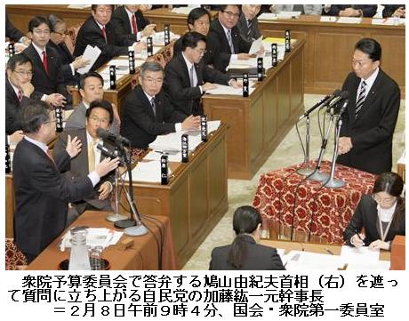 秘書の罪は議員の罪? 加藤紘一氏の“逆襲”に首相しどろもどろ ―― 鳩山由紀夫首相の資金管理団体の偽装献金事件をめぐり、自民党の加藤紘一元幹事長が8日の衆院予算委員会で質問に立った。首相は過去に加藤氏の秘書による脱税事件について「秘書の罪は国会議員の罪」と断罪していただけに、「因縁の対決」となった。/加藤氏は、首相の当時の発言が自身に向けられたことには触れずに、「どうして過去と現在で発言が違うのか。首相になったから責任は取らないのか」と追及した。首相は後ろめたさからか、「今置かれた立場で考えたときに、責任の果たし方を自分なりにさまざま思いあぐねた中で考えたところだ」としどろもどろ。さらに加藤氏の追及を受け、「当然その責めは私自身にもある」と認めた。/首相は平成14年3月の夕刊フジのコラムで、加藤氏について「もし鳩山由紀夫の秘書が同じことをすれば、国会議員バッジを外す」と述べた。加藤氏は秘書の脱税事件の責任をとって議員を辞職し、その後の衆院選で当選を果たした。 (産経ニュース、2010.2.8 18:08)