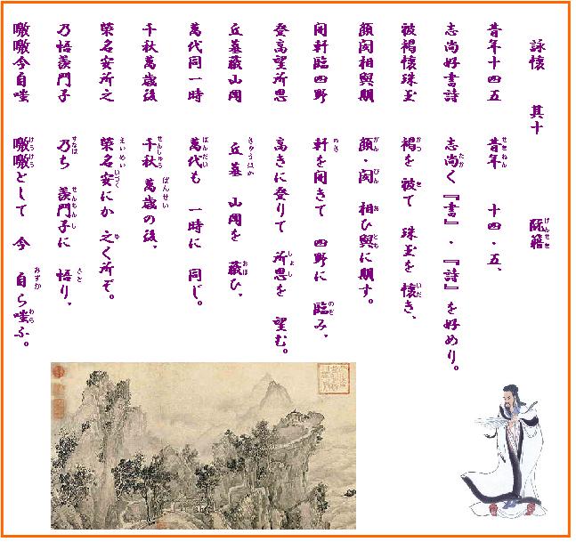 「訳:かつて 十四五歳の頃には/志操高く『書経』『詩経』を愛読し/粗衣をまとうも 珠玉の心をいだき/やがては顔淵(がんえん)か閔子騫(びんしけん)にもと思い/窓を開け放って 四方の曠野を眺め/髙処(たかみ)に登って 賢人たちを思いえがいたが/山や岡をおおいつくす 数知れぬ墳墓/万代の生き死にも 塚のうちに埋もれ/千秋万歳の 後にあっては/在りし日の栄誉も まこと夢か幻か/かくて悟ったは 羨門子(古の仙人)の道/からからと わが愚かしさを笑うのみである(平凡社刊、中国古典文学大系に拠る)」