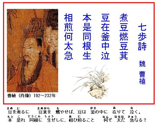 中国史上、有名な家族がある。父の曹操は、軍事戦略家で詩人でもあり、二人の息子曹丕と曹植は文学的にも非常に造詣があることから、この親子三人は“三曹”と呼ばれ、中でも曹植の文学的成果が最高とされた。曹操は文学評論家でもあり、その「典論・論文」は中国の文学評論史上、画期的傑作とされている。そして曹植は曹操の五男として生まれる。生母の卞氏(べん し、160~230年)は倡家(歌姫)の出身だが、『世説新語』賢媛篇に名を列ねる賢婦であった。同母兄に魏の文帝曹丕(そうひ、187~226年)、任城威王曹彰(そう しょう、? ~223年)、同母弟に蕭懐王曹熊(そう ゆう、生没年不詳)、子は曹苗(そうびょう、早世)、曹志(そう し、?~288年)、他に2人の娘がいた。異母兄の曹昂(そうこう、? ~197年)と曹鑠(そうしゃく、生没年不詳)が早世すると、197年頃に卞氏が正室に上げられ、曹植は曹操の正嫡の三男となる。幼い頃より詩など数十万言を諳(そらん)じ、自身も詩人であった曹操の溺愛を受ける。211年、平原侯(食邑5000戸)に封ぜられ、214年、臨葘(りんし)侯(同)に転封される。三男ではあるが、抜群の才能をもち、特に文学では当時最も優れた人物といえる。兄の曹丕は即位した後、弟の曹植の才能を妬んだ。ある日、小さなことで曹は「七歩のうちに詩を作れ」との難題を吹っかけ、曹植を処罰しようとしたが、皇帝となった兄の企みを悟った曹植は逆らえないと知って、仕方なく、「豆を煮て豆がらは燃え、豆は釜の中で泣く。もとはといえば同じ根から生まれたのに、どうしてそんなに激しくいりつけるのか」との詩を瞬く間に作った。これを聞いた曹丕は後悔し、その後は弟に害を加えなくなったという。