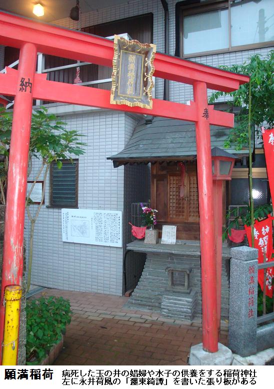《……車はオーライスとよぶ女車掌の声と共に、……法華堂の方からカチカチカチと木魚を叩く音が聞こえる。……これと向かいになった車庫を見ると、さして広くもない構内のはずれに、燈影の見えない二階家が立ちつづいて、その下六尺ばかり、通路になった処に、「ぬけられます。」と横に書いた灯りが出してある。……辻の向側には曹洞宗東清寺と刻した石碑と、玉の井稲荷の鳥居と公衆電話とが立っている。わたくしはお雪の話からこの稲荷の縁日は月の二日と二十日の両日である事や、縁日の晩は外ばかり賑やかで、路地の中はかえって客足が少ないことから、窓の女達は貧乏稲荷と呼んでいる事などを思い出し、……》