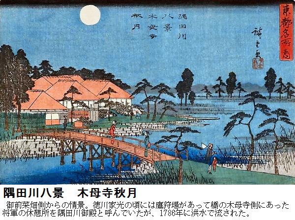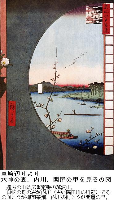 隅田川神社は水神宮の前は「浮島の宮」とも呼ばれていたようで、入間川と古隅田川の水流がぶつかりあう関係で中洲が生じていたのであろう。中洲が東岸とつながってゆくのは利根川東遷によって古隅田川の水量が減り、ついには廃河となる1700年頃と思われる。江戸時代での奥州路は千住大橋経由となっていて、当地は江戸庶民の観光地となっていたために水神という古典的な形を残したのかもしれない。