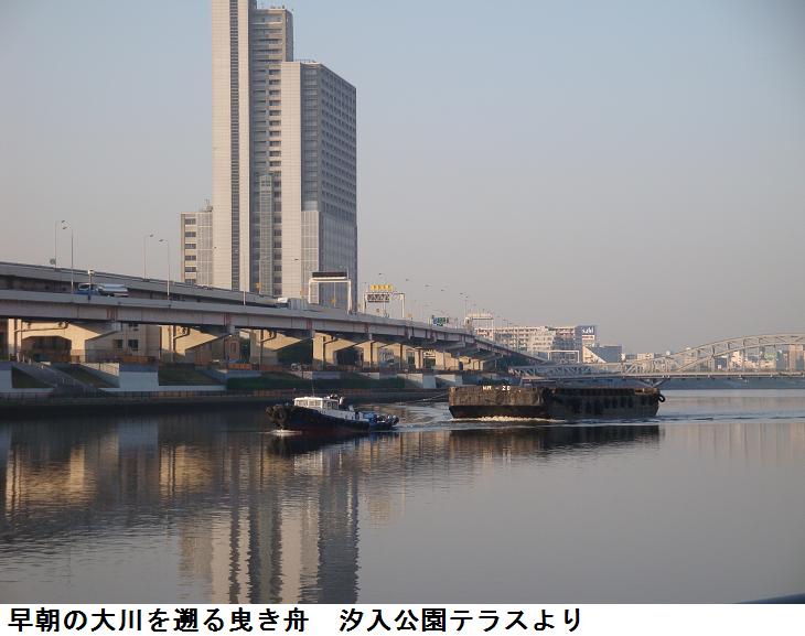 本日は午前4時半に家を出た。山谷堀の水門まで来ると久し振りの朝焼け。桜橋越しにご来光というところなので、カメラに収めた。隅田川沿いの遊歩道を北上、明治通りを横切り、荒川区の隅田川遊歩道を瑞光橋二むけて歩く。振り返ると、白鬚橋越しにアサヒビール配送場と共栄倉庫のビルの間に、東京スカイツリーの工事現場のクレーンが見える。
