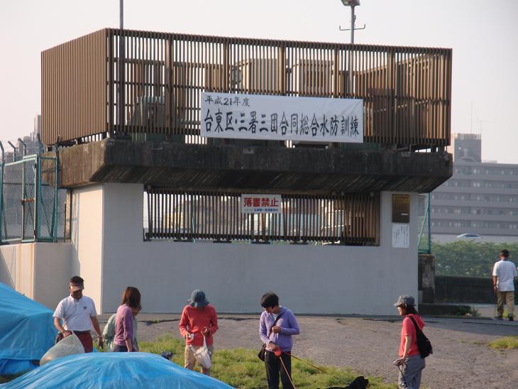 山谷堀水門の前には、消防署の車が止まり、テントが張りメグされ、水門には合同水防訓練の掲示がしてある。どうやらここで、消防署合同の水防訓練が行われるらしい。
