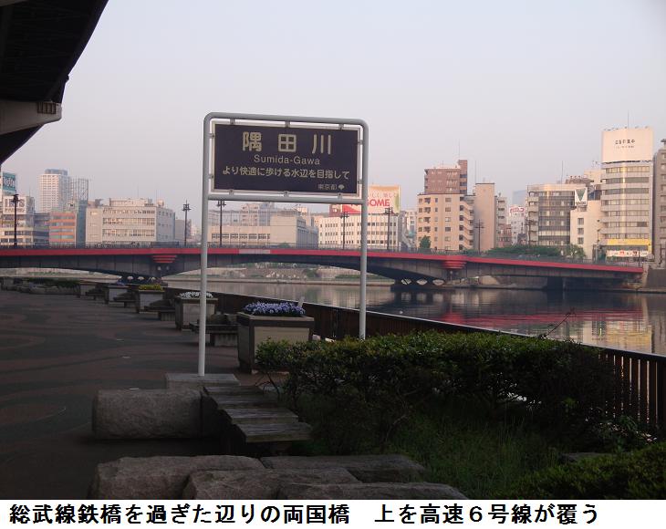 水神大橋から下流を眺めると先ほど通ってきた道が霞んで見える。水神大橋を渡って、鐘ヶ淵陸橋の交差点から、鐘ヶ淵通りを東に向けて歩くと、程なく東武線の鐘ヶ淵駅である。この駅は踏み切り越しに西口と東口の2手に分かれている。