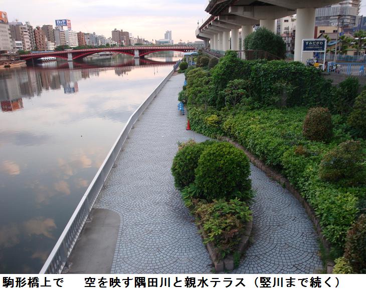本日は4時30分に目が覚め、家を出たのは4時45分。隅田公園を南下しながら、今日は足を伸ばすのはやめにして、吾妻橋西詰めで見慣れた光景をカメラに収め、江戸通りを南下、駒形橋にかかると炎のオブジェが違った角度で見えたので、これもカメラに収めた。駒形橋の上から下を見下ろすと、今日は波1つない隅田川に初夏の空が映し出されている。いつも通るテラスも含めて写真に収めた。