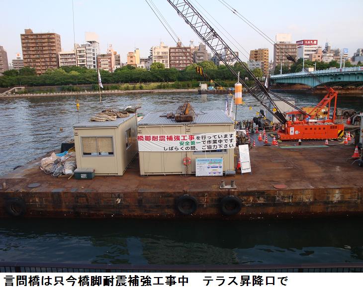 新大橋と清洲橋の間で川は大きく蛇行して南東から南西に向けて流れるようになる。日本橋中洲の停泊所に日本橋消防署の巡視線が停泊して付近から清洲橋が見えてくる。清洲橋は萬年橋辺りから見るのが一番綺麗といわれているが、このテラスからの清洲橋もなかなか綺麗で捨てたものではない。