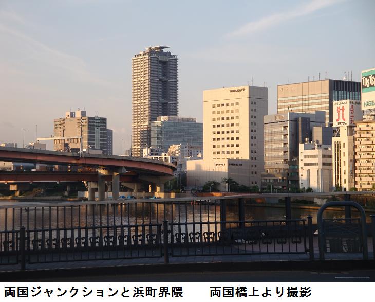 この間上流から東京湾に向う何艘かの釣り船に追い越された。どの釣り船にも4・5人の釣り人らしき人を乗せている。ここの親水テラスは一部両国ジャンクションの下になっている。高架線の隙間から明治座が朝日を浴びているのが見える。