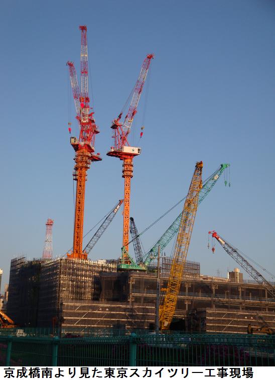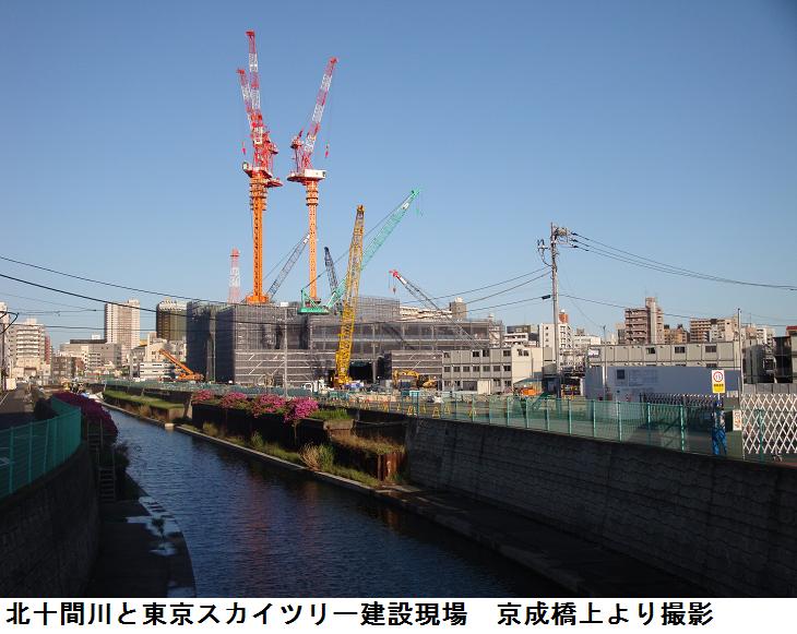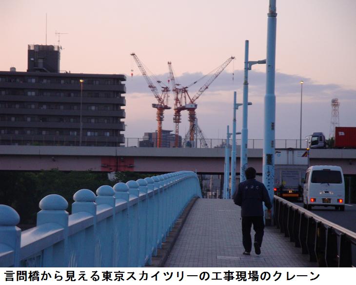 四つ目通りを新大橋通りまで北上すると、東京メトロ半蔵門線の住吉駅から乗車して押上まで地下鉄で来た。A3出口から東武伊勢崎線に沿って業平橋までの間は線路越しに東京スカイツリーの建設現場である。言問橋通りから言問橋を渡り帰宅した。