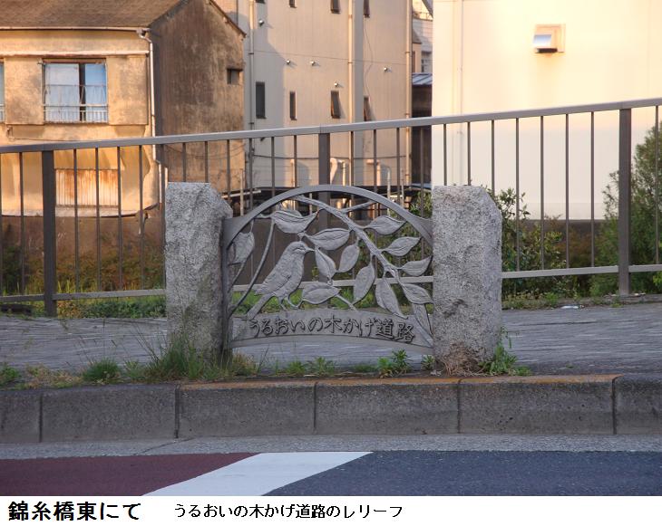 昨日徘徊した横十間川のさらに南を探索すべく、昨日と同じコースを取る。天神橋と錦糸橋の丁度中間辺りに「亀戸銭座跡」のモニュメントを見つけた。寛文8年に亀戸銭座で造られた「寛永通宝」をモデルに作成したもので、レリーフには、(銭座絵巻)(享保13 《1728》 年)より銭座で行われていた銅貨製造工程のうち、平研(銅貨の表面を磨く)作業をしている図(日本銀行貨幣博物館所蔵)の絵を参考にしたものが描かれている。江戸時代に銅銭が本格的に鋳造されたのは、寛永13《1636》年に始まるという。そのため、幕末までに造られた銅銭は全て寛永通宝と称し、「寛永通宝」の文字が打ち出されている。錦糸橋の袂に「うるおいの木かげ道路」のレリーフが作られていた。