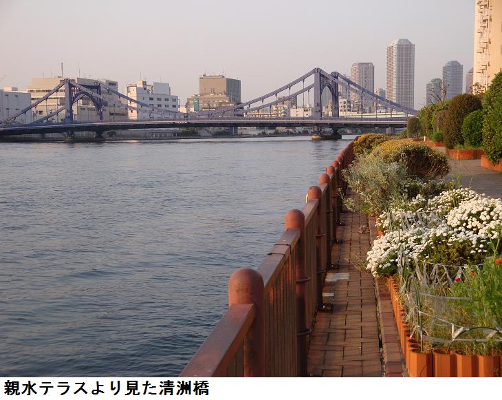 前方に西岸の日本橋中洲と東岸の清澄町を結ぶ清洲橋が見える。この橋は「震災復興の華」と呼ばれた優雅デザインで、当時世界最美の橋と呼ばれたドイツのケルン市にあった大吊り橋(第2次世界大戦で破壊されて現在はつり橋ではない)をモデルにしているという。清洲橋下のテラスから前方を見ると高速深川線と隅田川大橋があり、その間から遠く永代橋が見え、その後方に佃島の大川端リバーシィのビル街も見える。