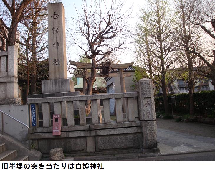 言問通りに出ると、ここから見番通りに入る。ここは向島の花街として栄えたところで、今でも幾つかの料亭が残っている。隅田川七福神のコースでもあり、三囲神社・弘福寺・長命寺などが並び、長命寺を過ぎると墨堤通りへと続く。地蔵坂通りの入口の子育て地蔵尊の堂の付近から白鬚神社までのところに旧墨堤之道が残っている。この旧墨堤之道を通って白鬚神社に出た。