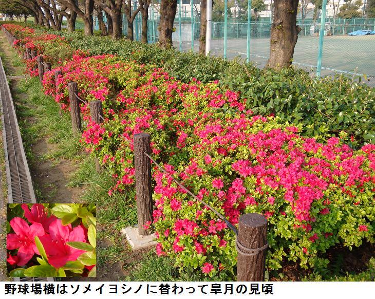 野球場の所までくると、ソメイヨシノに替わって、皐月が鮮やかな緋色の花を咲かせていた。良く見ると皐月の潅木の陰に蒲公英が黄色の花を付けていた。