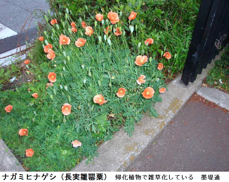 昨日より、気温は低いく、東の空はどんよりと曇っているが、南天には下弦の月が輝いているから、どうやら天気はよくなるらしい。山谷堀水門の前から桜橋を渡り、言問団子の前を通り墨田区の少年野球場の横に出ると躑躅が色とりどりに咲いている。墨堤通りの歩道にはヨーロッパ原産といわれる長実雛罌粟(ながみひなげし)がサーモン色の花を付けている。帰化植物だというが、荒地に持つ良く近年雑草化してどこにでも見られるようになったらしい。
