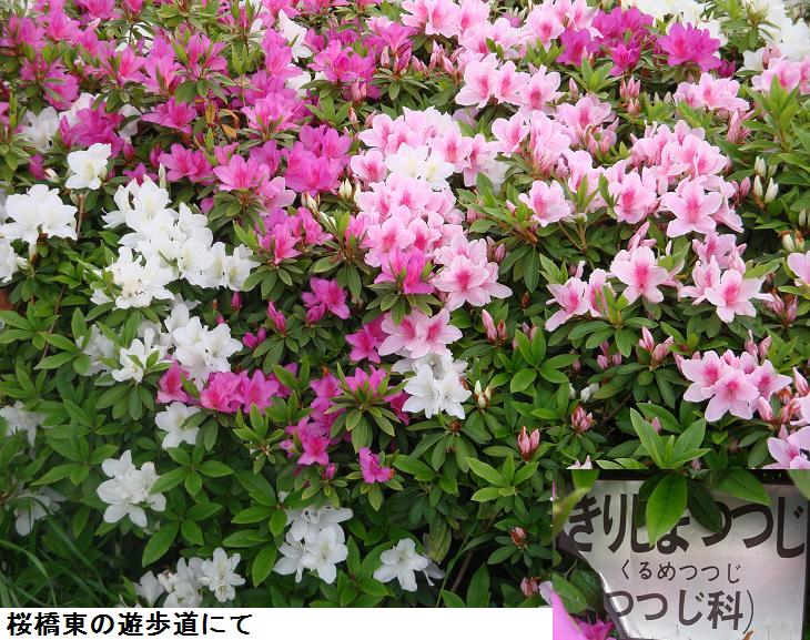 瑞光橋から水神大橋にかけての親水テラスには遊歩道に沿っていろいろな種類の躑躅(つつじ)が植えられている。今まで緑一色であった土手の野草もいろいろな色の花を付けている。ところで、ツツジには躑躅(てきちょく)なんて難しい字を当てるようになったのだろうか? 中国で毒性のあるツツジを羊が誤って食べたところ、足踏みしてもがき、うずくまってしまったと伝えられ、このようになることを躑躅(てきちょく)と言う漢字で表したのだそうだ。従って、中国ではツツジの名に躑躅を当て、日本へもその中国で使われていた名称の躑躅が入って、つつじと読むようになったいう。