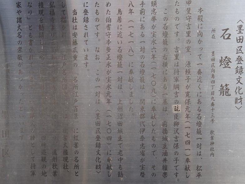 ここ向島の秋葉神社は由緒は説明板にある通りだが、「石灯籠」の説明にあるように、秋葉神社の紅葉は江戸中になりひびいていた。また境内に諸々の病に効く神泉が湧き出るとして多くの人が神泉をもらいに来ていたという。