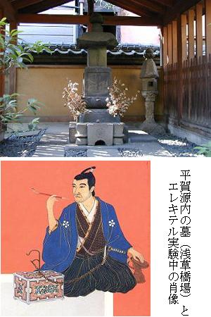 平賀源内(ひらがげんない、1728~1780年)については、承知のように天才、または異才の人と称される。鎖国を行っていた当時の日本で、蘭学者として油絵や鉱山開発など外国の文化・技術を紹介した。文学者としても戯作の開祖とされ、人形浄瑠璃などに多くの作品を残し、また平賀焼などの焼き物を作成したり、多彩な分野で活躍した。男色家であった為、生涯にわたって妻帯せず、歌舞伎役者らを贔屓にして愛したという。わけても、2代目瀬川菊之丞(瀬川路考)との仲は有名。『解体新書』を翻訳した杉田玄白(1733~1817年)をはじめ、当時の蘭学者の間に源内の盛名は広く知られていた。玄白の回想録である『蘭学事始』は、源内との対話に一章を割いている。源内の墓碑を記したのも玄白で、「嗟非常人、好非常事、行是非常、何死非常」(ああ非常の人、非常のことを好み、行いこれ非常、何ぞ非常に死するや(貴方は常識とは違う人で、常識とは違うものを好み、常識とは違うことをする、しかし、死ぬとき位は畳の上で普通に死んで欲しかった。)とあるそうで、源内の才能に玄白が驚嘆しその死を惜しんだことが伺われる。酔って記憶があいまいだったとは言え、勘違いで人を殺してしまった源内、安永8(1779)年11月21日、小伝馬町の牢獄につながれ、刑が確定しないまま、12月18日に死亡してしまったそうじゃ。破傷風だったとも、自殺だったとも言われているそうじゃ。有名人の源内が殺人を犯し、牢獄で死亡… しばらくの間、江戸ではこの話で持ちきりだったそうじゃ。田沼意次が事件の黒幕だという小説が出たり、牢を抜け出し蝦夷に渡ってアイヌの英雄になったという噂がでたりもしたということじゃ。科学者としての業績には、オランダ製の静電気発生装置エレキテルの紹介、火浣布の開発がある。一説には竹とんぼの発明者とも言われ、これを史上初のプロペラとする人もいる。気球や電気の研究なども実用化寸前までこぎ着けていたと言われる。ただし、結局これらは実用的研究には一切結びついておらず、後世の評価を二分する一因となっている。『エレキテル』は、故障していたオランダ製のものを修復したものであり、その原理については源内自身はよくわかっていなかったとする説が有力である。「夏バテ防止の為に土用の丑の日に鰻を食べる」風習は、夏場の売り上げ不振に悩んだ鰻屋に請われて、平賀源内が考案した「本日土用丑の日」という広告が元との説が文政5年(1822年)の『明和誌』にある。また、明和6年(1769年)にはCMソングとされる、歯磨き粉『漱石膏』の作詞作曲を手がけ、安永4(1775)年には音羽屋多吉の清水餅の広告コピーを手がけてそれぞれ報酬を受けており、これらを以て日本におけるコピーライターのはしりとも評される。浄瑠璃作家としては福内鬼外の筆名で執筆。時代物を多く手がけ、作品の多くは五段形式や多段形式で、世話物の要素が加わっていると評価される。江戸に狂歌が流行するきっかけとなった大田南畝(1749~1823年)の『寝惚先生文集』に序文を寄せている他、風来山人の筆名で、後世に傑作として名高い『長枕褥合戦』や『萎陰隠逸伝』などの春本まで残している。衆道関連の著作として、水虎山人名義により 1764年(明和元年) に『菊の園』、安永4年(1775年)に『男色細見』の陰間茶屋案内書を著わした。鈴木春信(1725?~1770年)と共に絵暦交換会を催し、浮世絵の隆盛に一役買った他、博覧会の開催を提案、江戸湯島で日本初の博覧会『東都薬品会』が開催されたということじゃ。爺達が文章の「起承転結」を説明する際によく使われる、「京都三条糸屋の娘 姉は十八妹は十五 諸国大名弓矢で殺す 糸屋の娘は目で殺す」の作者は源内である聞いたことがある。源内の墓と肖像画