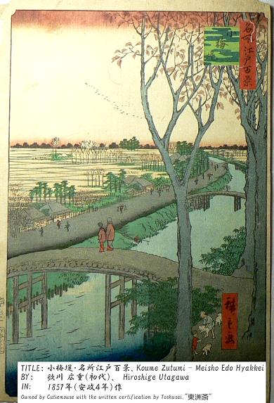 「小梅橋」は、新しいもので江戸時代や明治時代の地図にも出てこない。また、現在でも普通の地図では名前が書かれていない可哀そうな橋なんじゃと。江戸時代に描かれた隅田川向島絵図によると、現在の小梅橋を渡ったあたりのところに「小倉庵」(古地図で○で囲んで置いた)という料理屋があったらしい。江戸時代には、「今戸で大七 有明桜、小梅でおしるこ 小倉庵」とうたわれたほど有名だったそうです。 はじめておしるこを料理として出したのも小倉庵だそうですよ。“隅田川向島絵図”で、“小倉庵”の表記を見ることができます。ただ、残念なことに、幕末に旗本の青木弥太郎(やたろう・家禄二百石、元勘定衆)と強盗を働いた一味の一人に、この小倉庵の跡取り息子の長次郎がいたそうで、いろいろあって今では跡形もありません。古地図の右側の大きな川が、隅田川。地図の一番上を横に流れているのが、北十間川(きたじゅっけんがわ)。北十間川は業平橋(なりひらばし)のあたりで堰きとめられていたんじゃ。古地図の上の部分に「小梅村」と横に書かれているところが、新タワーの建設予定地なんじゃ。