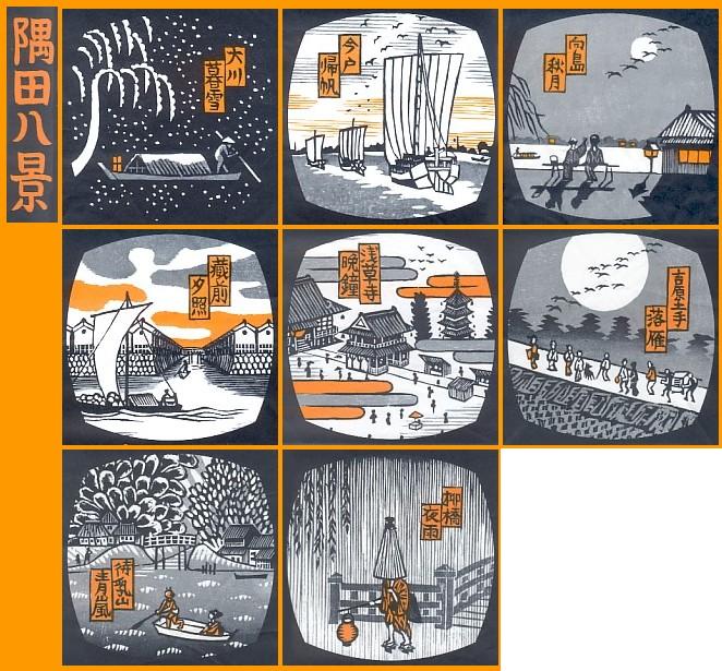 気をつけてみないと判らないが、よく観ると枕橋の渡り口の欄干の下に「隅田八景 枕はし夜雨」のレプリカが掘り込んである。二代 広重 画 と記されている。とある芋きん屋の包み紙に隅田八景が描かれている。