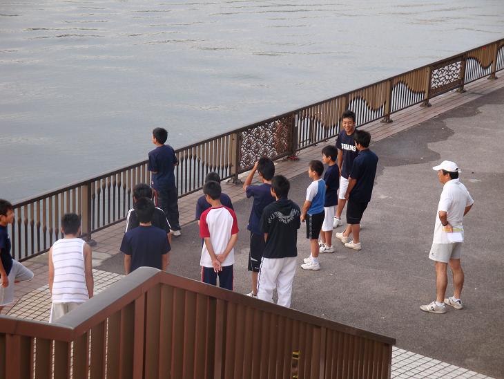 今日は、5時過ぎに家を出た。桜橋をわたり夏の青空につられて、水神大橋まできたが、首筋を照りつける太陽が肌に痛い。テラスでは釣りを楽しむ人がいる。